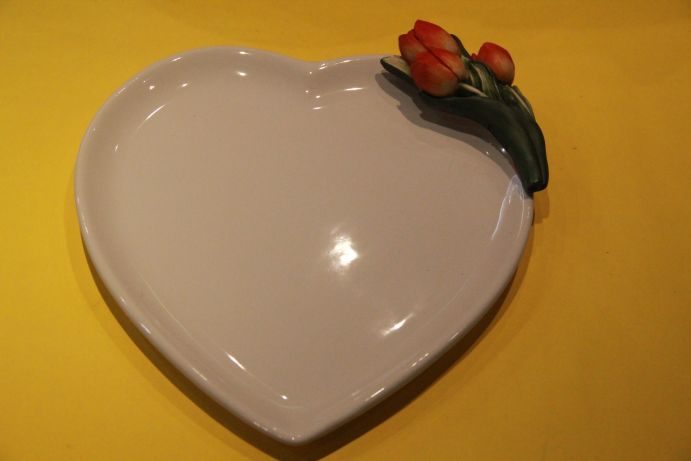 Vassoio a forma di cuore in porcellana con tulipani. i decori riportati sono interamente fatti a mano.