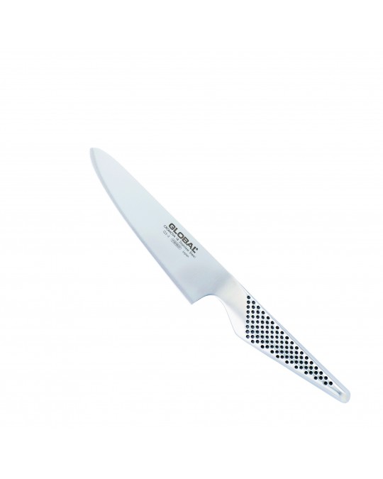 Coltello con lama Tranciata in acciaio speciale CROMOVA 18 al molibdeno-vanadio, con grado di durezza 56-58 HRC (Scala Rockwell). Il manico in acciaio inox e cavo e riempito con sabbia per una perfetto bilanciamento del coltello. La lama e affilata a mano per un ottima tenuta del filo. La serie GS si caratterizza per una manicatura a forma ” triangolare” che meglio si adatta ad un utilizzatore con mani piccole – come le donne – e lame piu corte rispetto alla serie G. I coltelli GLOBAL GS sono ottimi per mondare e tagliare ortaggi e frutta, lavorare pesce e crostacei.